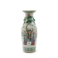 Porcelain painted with polychrome enamels, the body with a scene with some figures on a veranda assisting to a sword fight between two deities on clouds, section towards the base, shoulder and neck with floral motifs reserved on a geometric ground.