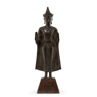 Bronze on a wooden pedestal, the standing deity with both arms bent at the elbow and hands with open palms in a gesture of reassurance, wearing a loose robe with ornaments in relief, the face surmounted by a crown, wood pedestal.