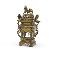 Gilded bronze, three pieces, the container with four feet resting on a roughly square base, the lid surmounted by a full-relief animal, all the decorative elements inspired by bamboo.