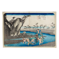 Large-format polychrome woodblock print (oban) from the series “Fifty-three Stations of the Tokaido”.