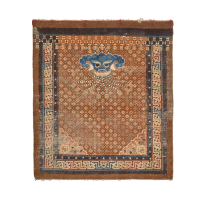 Polychrome decoration, geometric border, stylized flowers in the center against which stands a Buddhist lion's head.