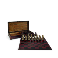 Carved and lacquered wood, fake ivory chessmen, the outside of the lid with ladies on a terrace, the inside with printed paper, the chessboard adorned with dragons and phoenixes, metal accessories.