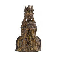 Gilded bronze, the seated Taoist deity wearing a wide robe with flowing drapery, his hands on his chest holding the hu tablet, his head with a headdress decorated with birds.