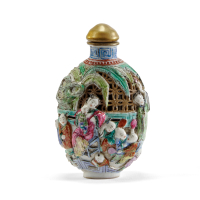 Porcelain with polychrome enamel decoration in relief of figures, some openwork details, apocryphal Qianlong mark impressed to the centre of the base.