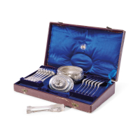 Set including an oval sugar bowl with goat's feet with geometric decoration embossed and chiselled, the lid topped by a rose, together with twelve teaspoons and a sugar tongs, in an original shaped cardboard, velvet and silk case.
