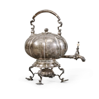 With shaped base and a shaped and fluted warmer, pumpkin-shaped teapot with long zoomorphic tap and shaped tilting handle.