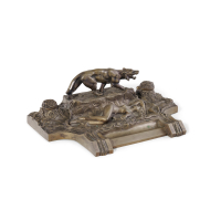 Gilt-bronze, with two ink holders and a pen holder, shaped, depicting a reclining naked girl, overhanged by a lioness.