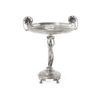 Circular base on four geometric feet, stem in the shape of a female figure holding a vase, circular cup with spiral handles with flowers.