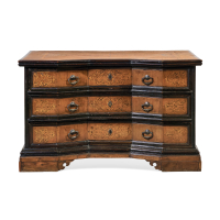 Inlaid fruit wood with ebonised profiles, geometrical and shaped front, with three drawers, on bracket feet.