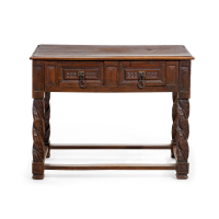 Walnut, with two drawers carved with plant motifs, on four twisted columns joined by crosspieces.