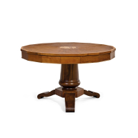 Walnut, with precious woods and ebonised woods inlays, round top with geometric pattern and central rosette, tripod.