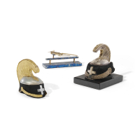 Lot including a silver, silver gilt, horse hair and slate paperweight depicting a cavalry helmet, a silver, silver gilt and lapis lazuli paperweight in the shape of a crossbow and a silver and gilt plated and cloth miniature cavalry helmet missing the base and the