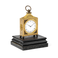 Gilt-metal case decorated with floral fittings and turned feet. Circular silver-plated metal dial with Roman numerals and pierced hands, manual-winding movement with 8-day power reserve.On ebonised wooden base.