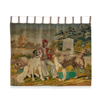 Depicting a young figure with three dogs in a landscape with classical architecture and foliage.