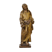 Carved, sculpted, painted partially gilt-wood.