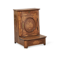 Walnut and burl wood inlaid in precoius woods, one drawer and one door centered by a medallion.