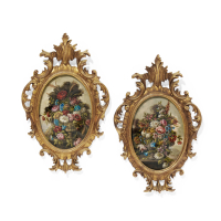 Carved gilt-wood, including a pair of flowers still lives on paper.