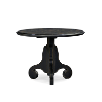 Ebonised wood, the round top inlaid with semiprecious stone and marble, inlaid with silver thread and geometric motifs, tripod with curled feet.