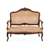 Carved walnut, shaped, with armrests and curved legs, ochre velvet upholstery.