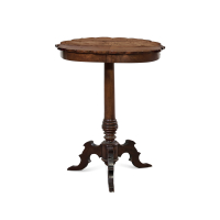 Walnut and burl wood, shaped circular top, on baluster shaft and tripod base.