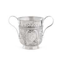 Embossed and chiseled body, with twisted gadroons at the base and neck, a reserve with an engraved monogram on the front, with scrolled handles.