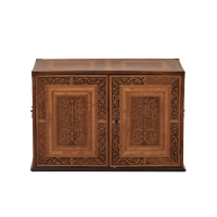 Inlaid wood in precious woods and partially ebonised, with double doors, drawers and a secret compartment inside.