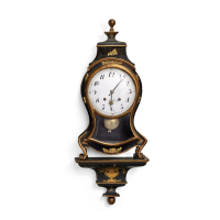 Ebonised wooden case with gilt decorations, complete with top pediment and wall bracket. White enamel dial with Arabic numerals, movement with anchor escapement, suspension spring, hour and quarter strike on gongs, alarm winding by pulling a rope.