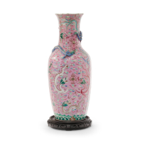 Porcelain molded in light shells and painted with polychrome enamels and touches of gold, pink ground with decoration of dragons chasing the Pearl in flight amidst clouds and darts, stylized waves at the bottom, two dragons in accentuated relief between the shoulder and
