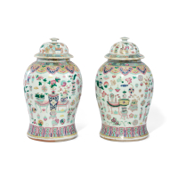 Porcelain with polychrome enamel decoration, body and lid with compositions of various objects and flowers, the lower section and the neck with bands of geometric motifs.