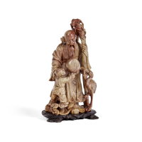 Soapstone, the standing god of longevity with a stick in his left hand, at his sides a child offering him a peach and a crane, an inscription incised to the lower side, on a wooden base.