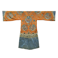 Apricot ground silk finely embroidered with polychrome and gold threads, decoration of dragons flying amidst clouds and darts, stylised waves and mountain peaks at the bottom.