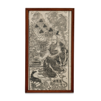 Large woodcut print depicting a deity surrounded by mythological animals in a landscape; within wooden frame and protective glass.