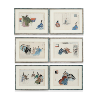 Group of six woodblock prints with scenes from the No theatre circa 1900