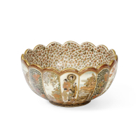 Satsuma ceramic painted with polychrome enamels and gold, wall and rim with lobes, the exterior with compositions of figures, flowers, birds and arabesques, the interior with a small and refined myriad of butterflies, "Kazan sei" mark (介山製) within a rectangular