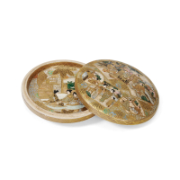 Satsuma ceramic painted with polychrome enamels and gold, the decoration consisting of reserves with figures in a landscape, "Satsuma" mark (薩摩) to the center of the base.