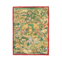 Colors on fabric, the Medicine Buddha in the center surrounded by a multitude of figures in the landscape, within wooden frame and protective glass.