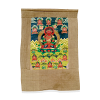 Colors on fabric, Padmasambhava in the center surrounded by a multitude of deities, within wooden frame and protective glass.