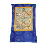 Colors on fabric, depicting Tantric Buddhist deities and mythological animals in the landscape, fabric frame.