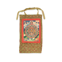 Colors on fabric, a mandala in the center, deities and a Dalai Lama amidst clouds at the top, deities in the landscape at the bottom, fabric frame.