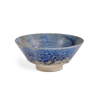 Glazed ceramic with blue streaks along the rim, partially legible provenance label.