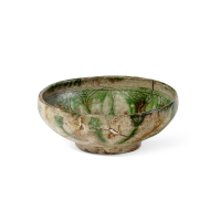 Green glazed ceramic, along the inner rim a band with geometric motif.