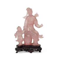 Carved light green jadeite, the two larger sides of the body with compositions in relief of flowers, birds and insects, the neck with animal heads-shaped handles with a ring between the jaws, the cover surmounted by a mythological animal-shaped cover.