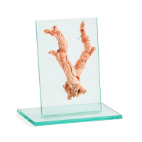 Pink coral, carved with two female figures, glued to a crystal support.