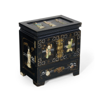 Lacquered wood with semi-precious stone and mother-of-pearl inlays, the larger doors on the front and the upper shelf with a decoration of figures, drawers inside.