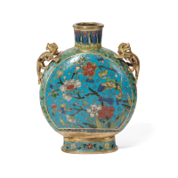 Polychrome cloisonné enameled metal, one side with a glimpse of a landscape with a peach tree and two deer, symbols of longevity, the other one with flowering branches and a butterfly, the shoulder with mythological animals-shaped handles.