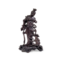 Carved wood, the standing deity with the rabbit in her hands, with which she lives in her palace on the moon.