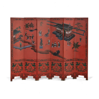Lacquered wood with a red ground and painted in polychromy, with six panels, the main scene with ethereal female figures inside a garden with pavilions, stylised floral compositions at the bottom, scattered bunches of flowers on the back.
