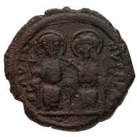 Giustino II (565-578) - Follis - Zecca: Costantinopoli - Diritto: Giustino II e Sofia nimbati in trono - Rovescio: M con sotto la scritta CON - gr. 11,78 - BB