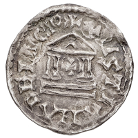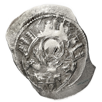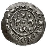 Monetazione al nome di Federico II di Svevia (1218-1250) - Denaro planeto - Diritto: busto laureato dell'Imperatore a destra - Rovescio: edificio sorretto da quattro archi e affiancato da due torri - gr. 0,93 - Rara - BB