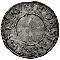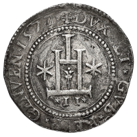 Governo dei Dogi Biennali (1528-1797) - Mezzo Scudo 1577 - Diritto: castello con due croci ai lati - Rovescio: croce patente accantonata da quattro stelle - gr. 18,52 - Sigle LB - Rara - Patina di medagliere, q.SPL - Proveniente dalla Collezione Astengo come da read all